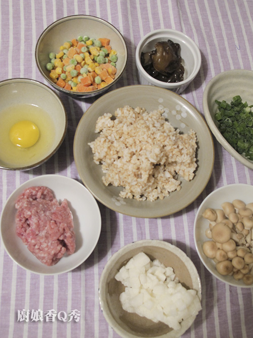 煮熟糙米飯一碗、黑木耳3朵、柳松菇1大匙、蛋一個、山藥半碗、碎豬肉2大匙、冷凍蔬菜(紅蘿蔔、碗豆、玉米粒)半碗、蔥花一大匙、鹽適量、白胡椒粉適量