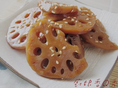 用一點冰糖,加一點醬油、水,紅燒至水份收乾,吃的時候灑一點熟白芝麻,這道蜜蓮藕,讓秋天的早晨頓時精神起來