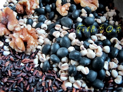 材料:黑豆30g、黑芝麻30g、黑糯米60g、百合10片、薏仁30g、核桃2顆、白米60g、蜂蜜適量(不喜甜者也可以不加)。