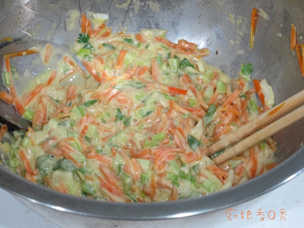 B 洋蔥1/4個、熟芝麻一小匙、芹菜兩根、香菜適量、蔥兩根、 中筋麵粉100公克、冰水適量、胡椒粉少許