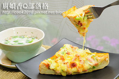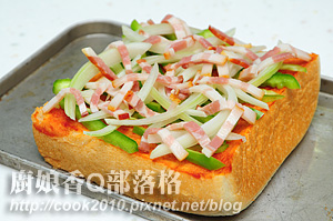 3. 先鋪青椒一層、再鋪洋蔥一層,再來鋪培根,最上面鋪起士絲。
